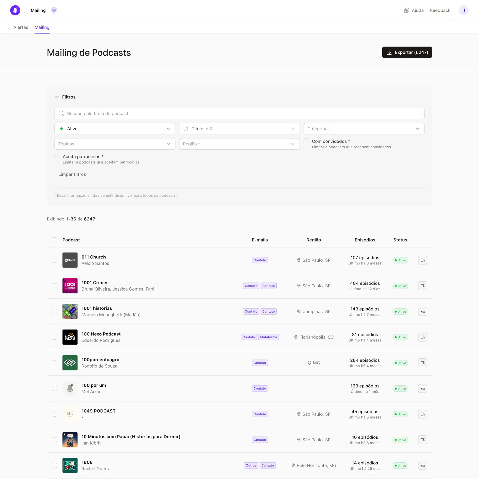 Abandone as buscas manuais. Nossa IA analisa milhões de episódios para classificar podcasts por tópicos reais, entregando os e-mails e contatos que você precisa para fechar parcerias e entrevistas.