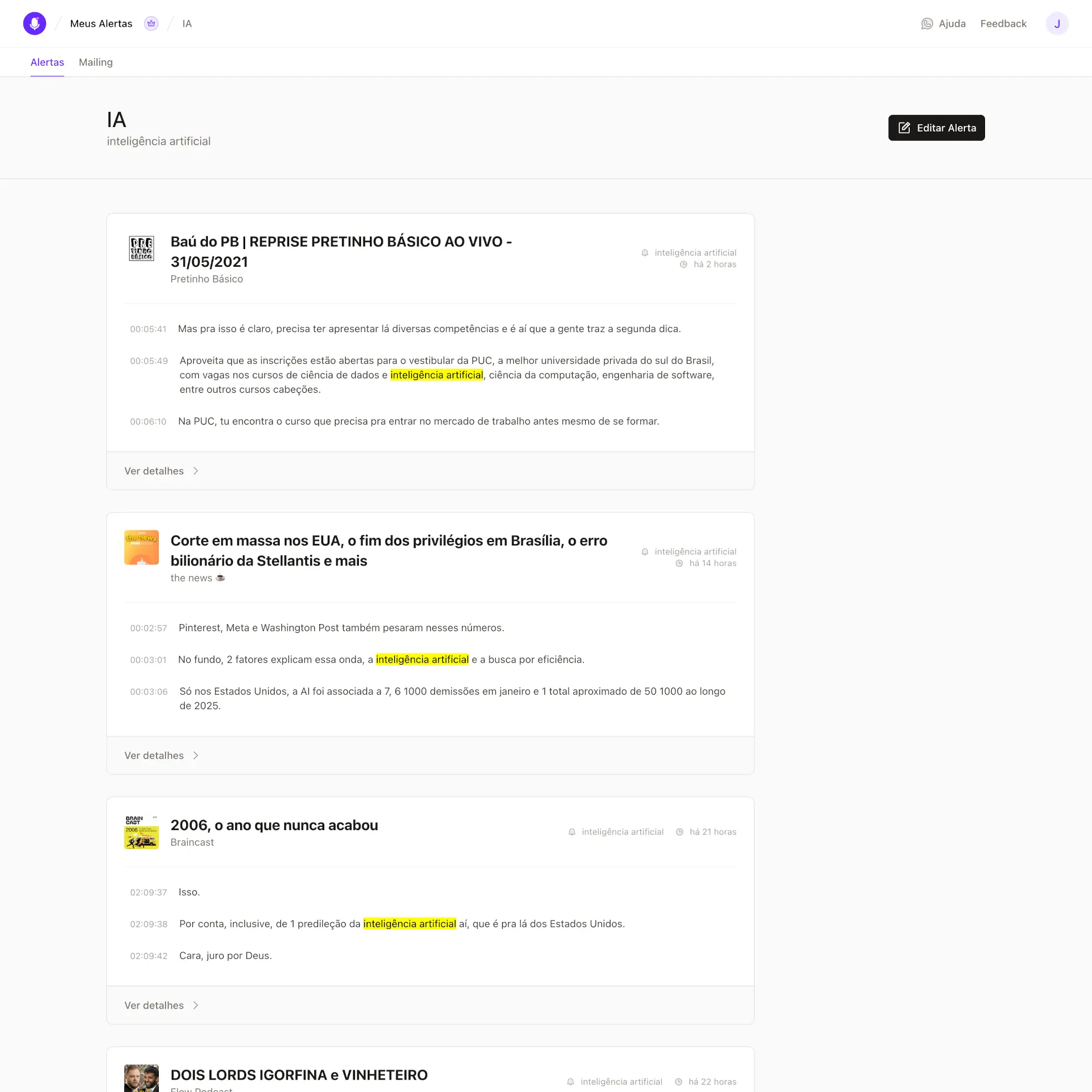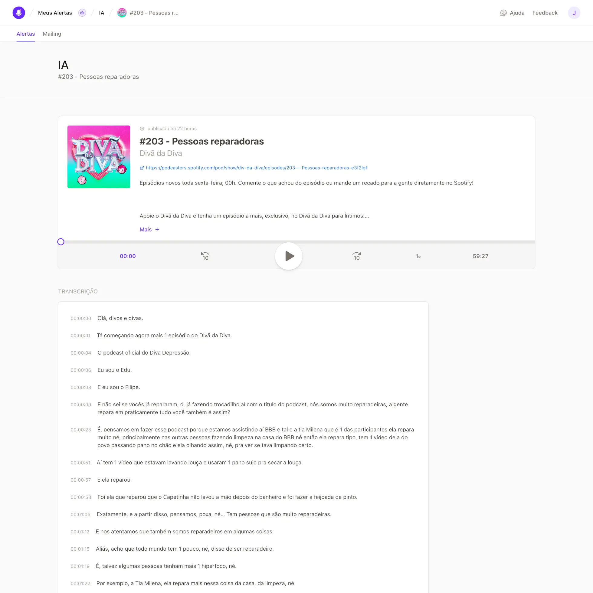 Vá além das redes sociais. Nossa tecnologia escuta milhares de episódios 24/7, transcreve o conteúdo e te alerta sempre que sua marca ou concorrente for mencionado.